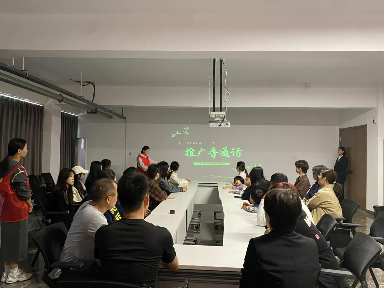 10月13日上午,郑州工商学院青年志愿者协会联合豫兴路社工站举办的“弘扬志愿精神,架起语言桥梁”推广普通话志愿服务活动在建业春天里二期会议室举行。校青年志愿者协会成员、社区居民参与其中。